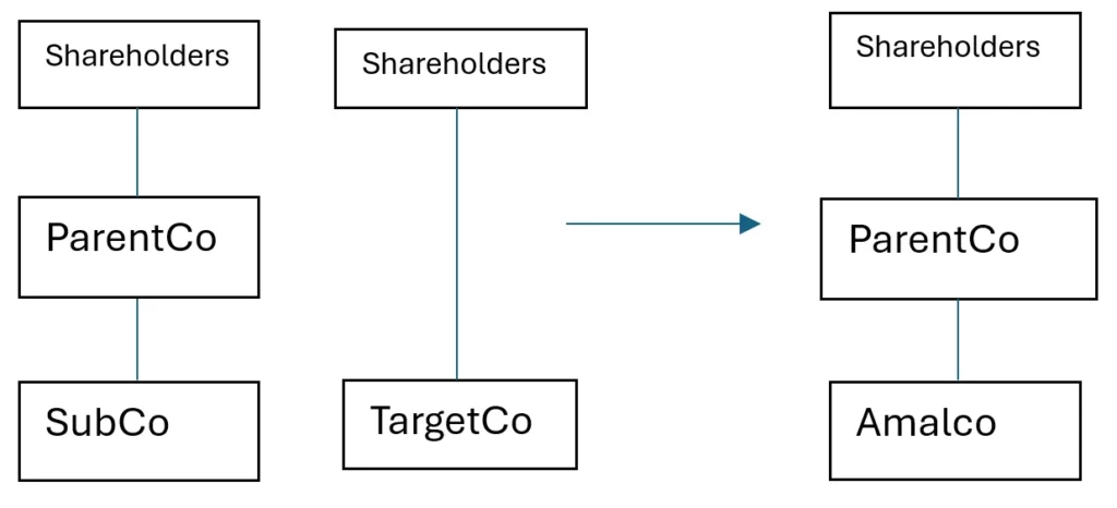 A triangular or three-cornered amalgamation can be used to effect an acquisition using consideration comprised of shares, or a combination of cash and shares. It is frequently utilized as an alternative to the takeover bid process under securities laws. For example, if a Canadian public corporation (ParentCo) wants to acquire the shares of another Canadian corporation (TargetCo) for share consideration, the transaction could be structured as: (i) a share-for-share takeover bid, (ii) a standard amalgamation of ParentCo and TargetCo, or as a triangular amalgamation of a subsidiary of ParentCo (SubCo) and TargetCo where TargetCo shareholders receive shares of ParentCo instead of shares of the amalgamated corporation (Amalco). In this case, ParentCo controls Amalco immediately following the amalgamation.