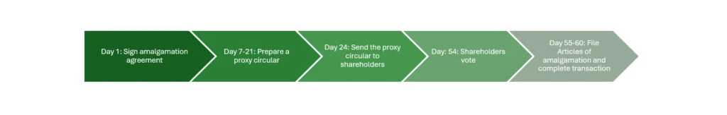 Amalgamations requiring shareholder approval may also operate on a lengthier timeline if a large number of shareholders need to be canvassed in order to obtain the necessary support. Each applicable corporate statute provides the necessary shareholder approval threshold for completing an amalgamation, which is at least over 50%, which threshold may increase given the provisions of applicable shareholder agreements or rights attributed to other share classes, such as preferred shares. Support agreements are often utilized in order to ensure the parties that the requisite shareholder approval will be satisfied. Timing may typically proceed faster in a private company context, as the corporate charter documents normally allow for a compressed notice period for a shareholders’ meeting, whereas in the public company context additional securities laws apply given the search processes involved in order to determine who the shareholders who are entitled to vote are as of a given record date.